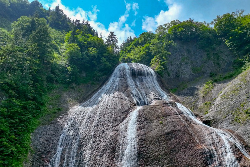 日本の滝百選に選ばれる東北最大級の巨瀑を見下ろすことができる。一枚板のような岩盤を幾筋かに別れ緩やかに滑り落ちる優雅な滝。