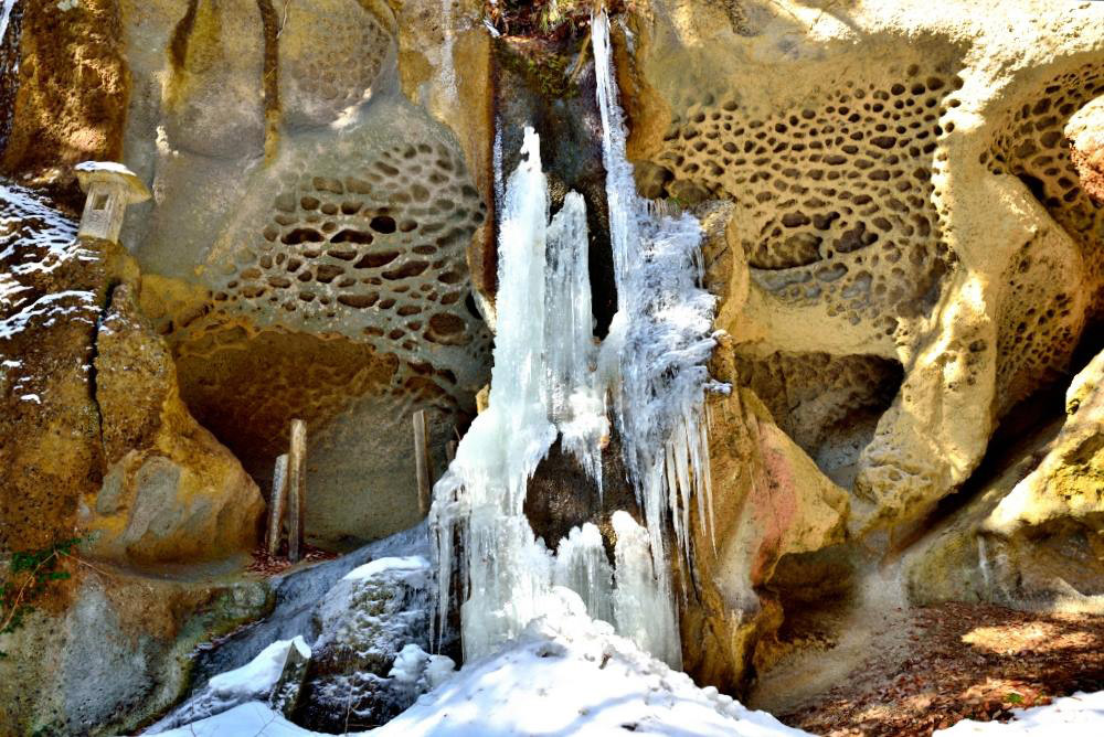 水の浸食によって形成された、蜂の巣状の巨大な岩壁の岩肌と鳥居の神秘的な造形美は、山形随一の絶景パワースポットとなっている。