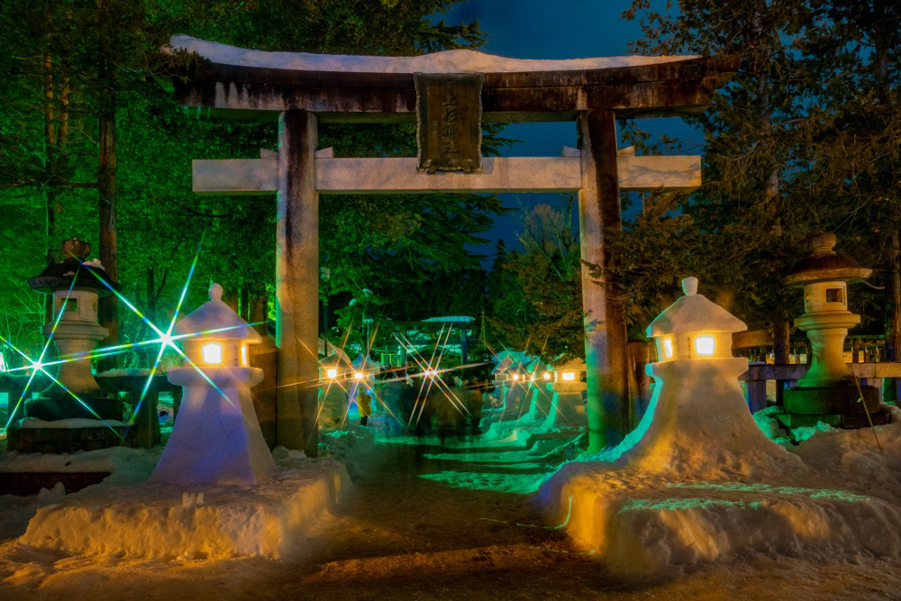 宵の訪れとともに、約200基の「雪灯篭」と1,000個の「雪ぼんぼり」のろうそくに次々と火が灯され、温もりのともしびが不思議と寒さを忘れさせます。白銀の雪景色にともしびが並ぶ幻想的な風景は「日本夜景遺産」にも選出されている絶景です。