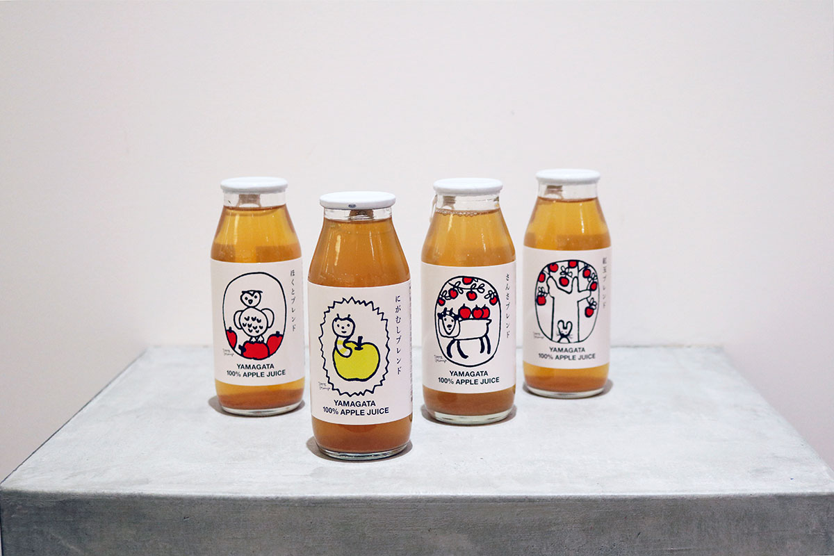 新庄市のリンゴ・カンパニー「リンゴリらっぱ」。その100%自家農園産リンゴ使用のジュースは、単品種だったりブレンドだったり、穫れるリンゴによってその時期の商品も替わるとのこと。100% APPLE JUICEという商品なのに、パッケージのイラストを描いた100%ORANGEさんのサインが並んで表記されているところもチャーミングで、思わず「どっちやねん!」とツッコミを入れてしまいそう。飲み終えたら飾りたくなるくらいのかわいさ。(左から、ほくとブレンド・にがむしブレンド・さんさブレンド・紅玉ブレンド 各421円)