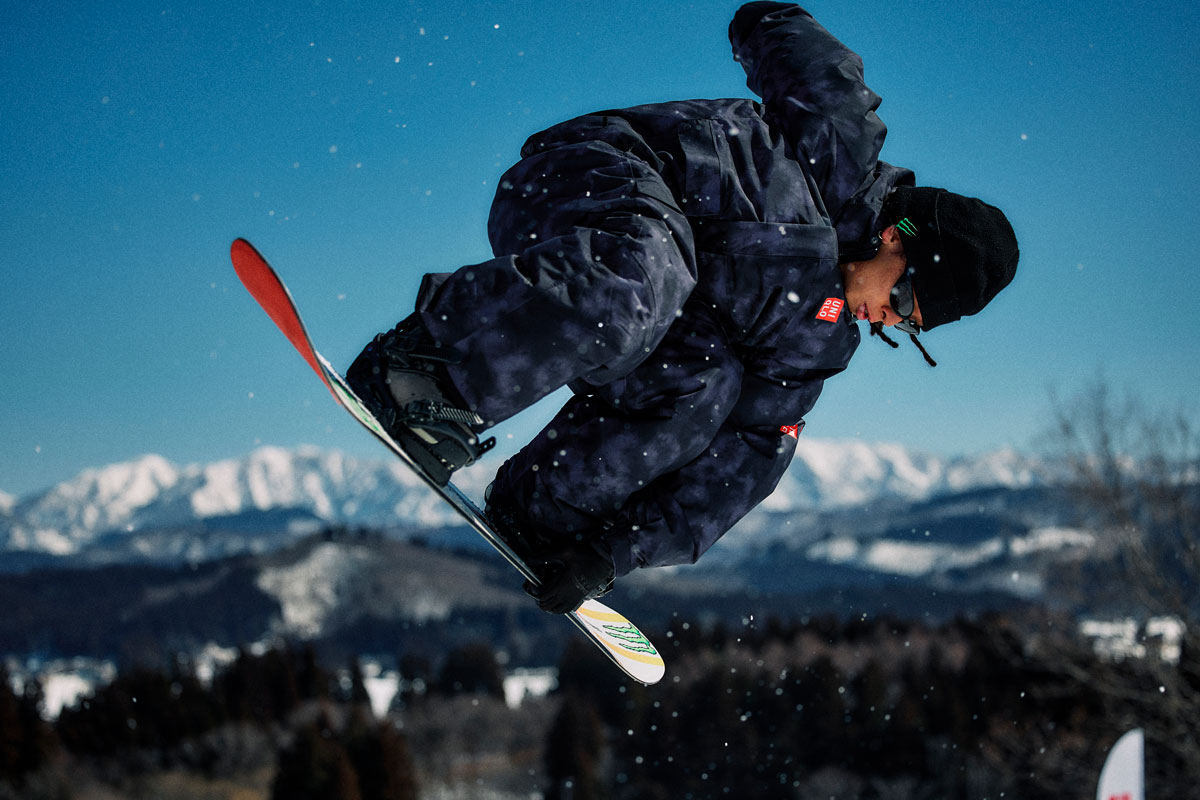 世界を制したトップスノーボーダーの滑りに、会場内にいる多くの人たちが魅了され、歓声を上げていました。そして飯豊連峰と朝日連峰の美しい山並みが見渡せるのも、横根スキー場の魅力のひとつ(画像提供:UNIQLO)
