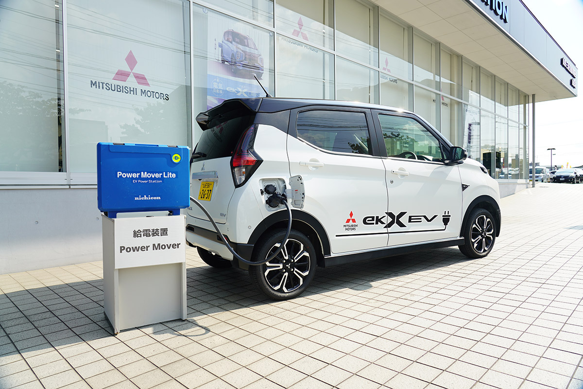 電気自動車eKクロス EV(i-MiEVの進化形)と給電装置「パワー・ムーバーⓇ」。eKクロス EVはフル充電することで一般家庭の約1日分※の電力が賄えるそうです(写真提供:山形三菱自動車販売株式会社)