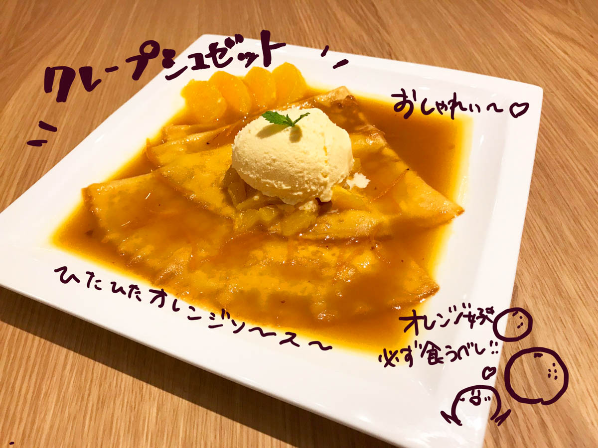 クレープシュゼット(1,050円)はホテルでしか食べられないような県内でも珍しいスイーツ。オレンジのリキュールを使った大人なソースにアイスの乗ったクレープが浸っています。ハーフサイズ(750円)もあります