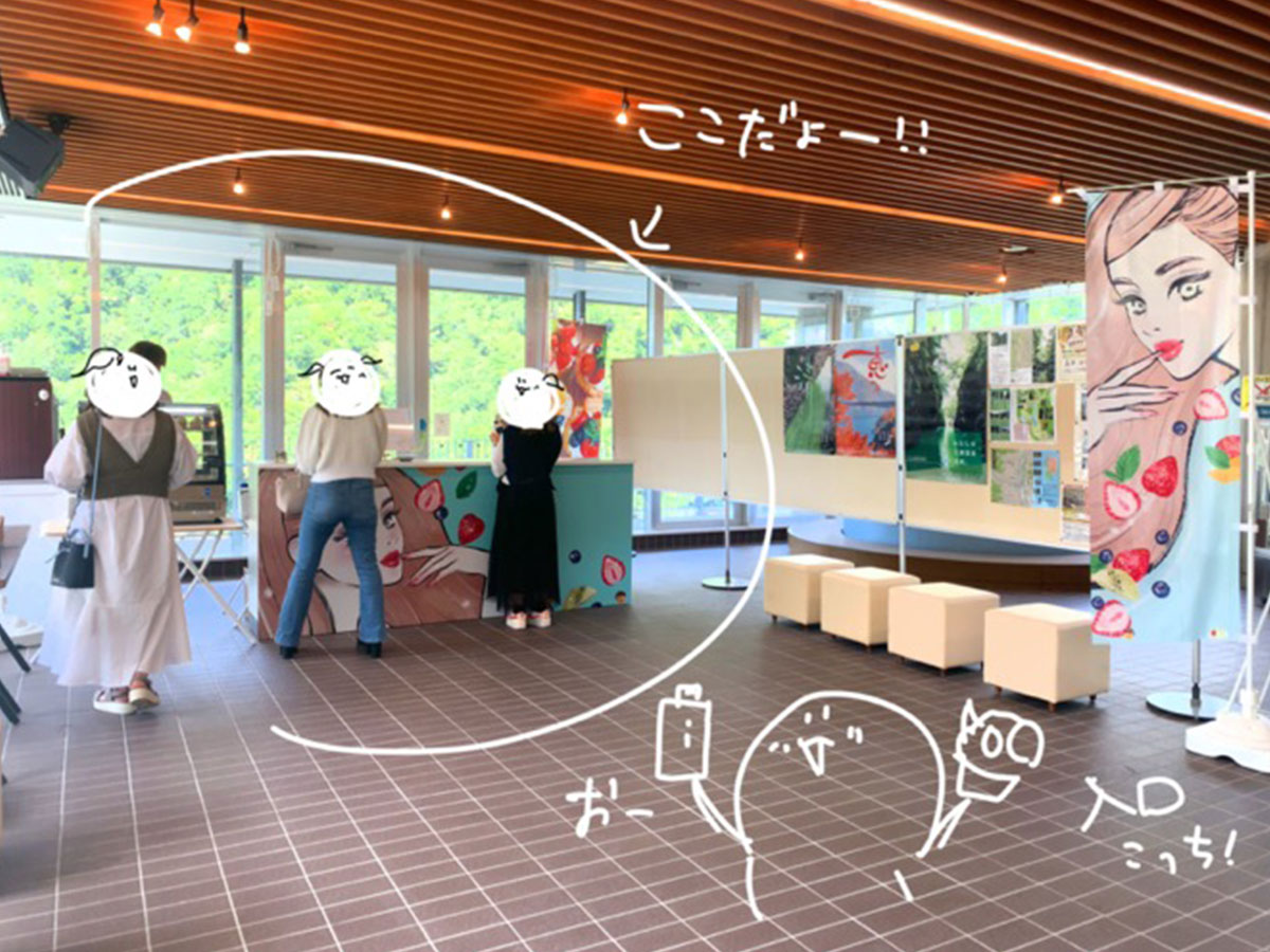 建物の中に入るとおしゃれなイラストの描かれてあるコーナーを発見!やっと見つけたという謎の達成感が味わえました