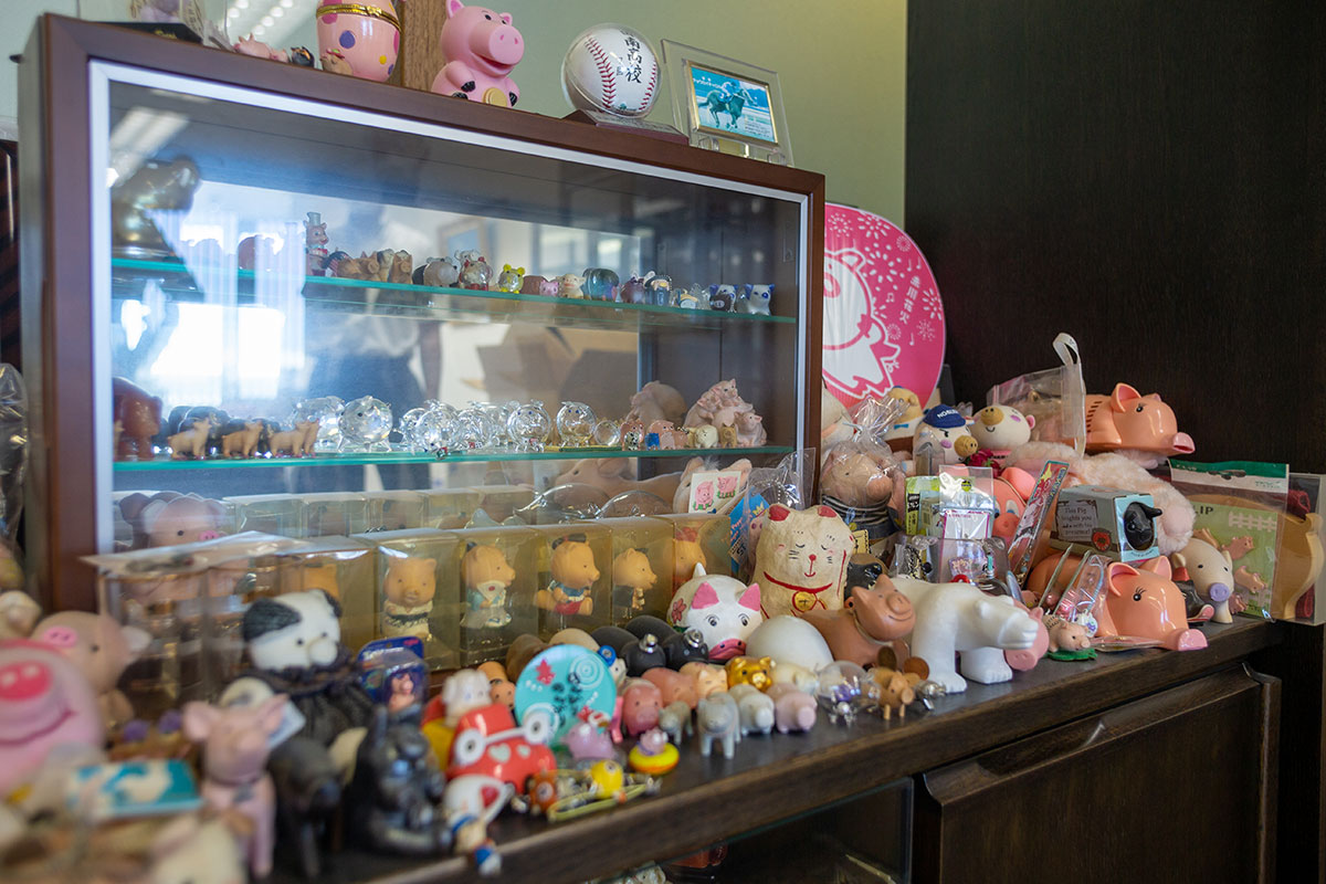 社長室に所狭しと飾られている、新田さんによる“豚さんコレクション”。「特に韓国あたりでは、豚って幸福の象徴なんですよね。自分が好きで集めたり、人にいただいたりしているうちに収拾がつかなくなってきました(笑)」